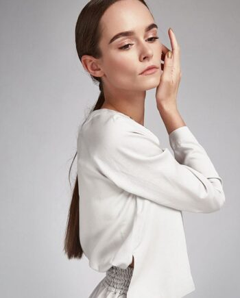 Cut from light and fluid mushroom washed silk-georgette, it’s designed with a wrap-effect front and a longer back hem for extra coverage. Team it with your favorite jeans and heels.